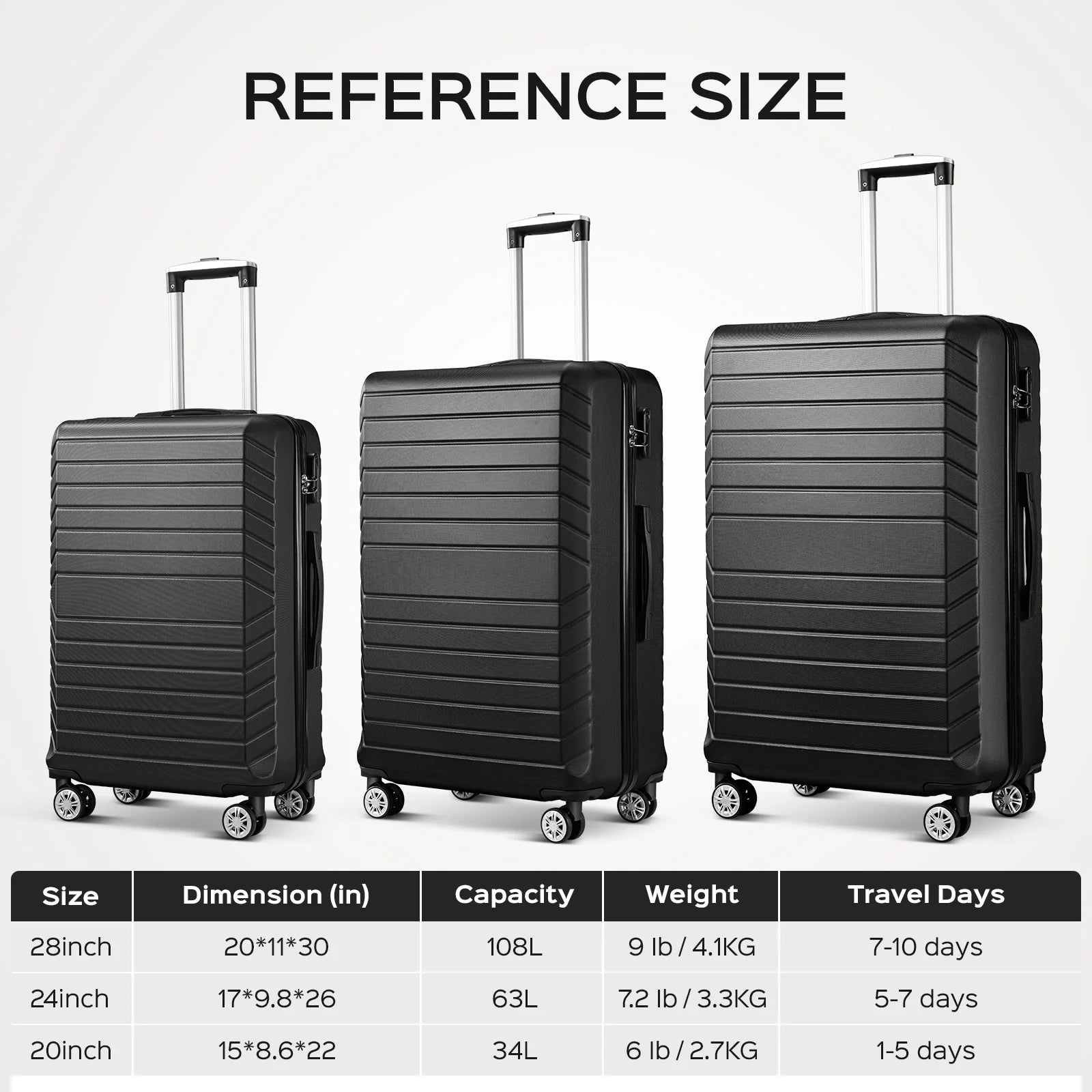 Juego de maletas de viaje de 3 piezas en ABS resistente, con tamaños de 20", 24" y 28". Incluye 7 bolsas organizadoras para maximizar espacio y mantener todo en orden durante tus viajes.